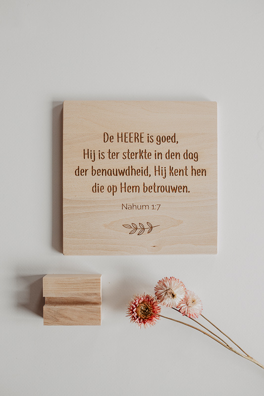 Wil je de bijbeltekst op hout mooi neerzetten? Bestel dan een houten houder mee zodat het tegeltje kan staan.