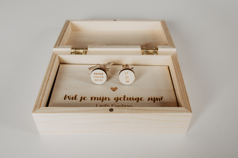 Ben je op zoek naar een origineel cadeau om je vader te vragen of hij je weg wil geven op jullie bruiloft? Met dit mooie doosje zal hij zeker geen nee zeggen. In het doosje zitten manchetknopen met de tekst 'Vader van de bruid' en op de andere is jullie trouwdatum gegraveerd. Zo heeft hij ook op de dag zelf een mooi cadeau wat hij kan dragen.